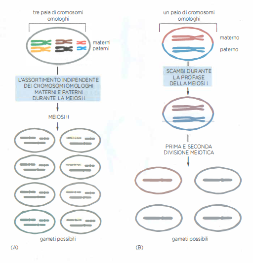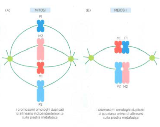 - ricombinazione: presente tra omologhi in profase I con formazione di chiasmi, assente nella mitosi;