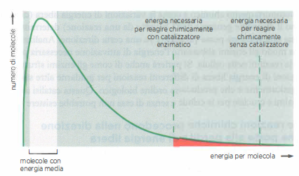Gli enzimi rientrano nella più ampia classe dei catalizzatori. Una riduzione di \(E_a\) aumenta la frazione di molecole che, alla temperatura della cellula, possiedono energia sufficiente per superare la barriera, come suggerito dalla distribuzione di Maxwell-Boltzmann (Figura 01.13-02). Effetti di accelerazione anche di \(10^{14}\) volte sono documentati per alcuni sistemi, rendendo accessibili, in tempi biologicamente utili, reazioni che a temperatura fisiologica risulterebbero di fatto impercettibili. A titolo esemplificativo, l’anidrasi carbonica accelera l’idratazione della CO₂ di molti ordini di grandezza, mentre la triose-fosfato isomerasi rende rapida un’isomerizzazione altrimenti lenta nelle condizioni cellulari.