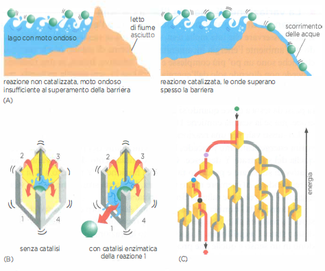 Il funzionamento degli organismi viventi è sostenuto da reti di reazioni chimiche altamente specifiche che avvengono all’interno delle cellule. La maggior parte di tali trasformazioni è catalizzata da proteine specializzate, gli enzimi, i quali, come qualunque sistema fisico, sono soggetti alla seconda legge della termodinamica. Gli enzimi accelerano reazioni termodinamicamente favorite, ossia processi che incrementano il disordine globale, ma non possono rendere spontanee reazioni che sono sfavorite dal punto di vista energetico. Eppure le cellule devono sintetizzare strutture ordinate e molecole ad alta energia a partire da precursori semplici, operazione che richiede apporto di energia. Per comprendere come gli enzimi rendano possibili e rapide le reazioni chimiche necessarie alla vita, occorre innanzitutto analizzare il bilancio energetico delle molecole: la loro energia libera condiziona la direzione e l’estensione delle trasformazioni chimiche, mentre le variazioni di energia libera misurano l’impatto della reazione sul disordine complessivo dell’Universo. In questo quadro, gli enzimi abbassano la barriera di attivazione che ostacola l’avvio delle reazioni e sfruttano l’accoppiamento fra processi con diversa variazione di energia libera per guidare trasformazioni altrimenti sfavorite, permettendo la costruzione dell’ordine biologico. Senza questa catalisi altamente regolata, i processi cellulari non risulterebbero compatibili con le condizioni della vita.