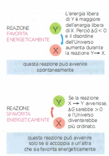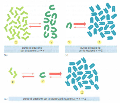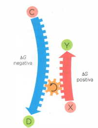 Un tema centrale dell’organizzazione metabolica è come la cellula realizzi trasformazioni sfavorite dal punto di vista energetico. Una strategia generale consiste nell’accoppiare reazioni sfavorite a reazioni fortemente favorite, in modo che la somma delle variazioni di energia libera risulti negativa. Se consideriamo due reazioni in sequenza, X ⇌ Y e Y ⇌ Z, la variazione complessiva standard di energia libera è additiva: