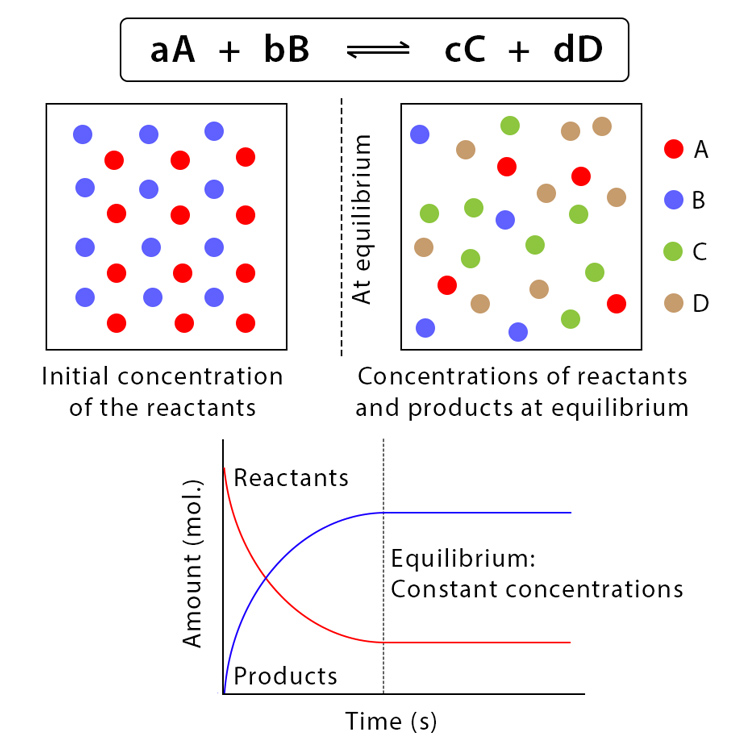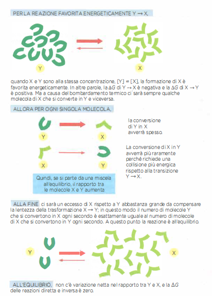 È immediato capire che un elastico teso, se lasciato libero, si accorcia restituendo calore all’ambiente. Le trasformazioni chimiche sono più articolate: la loro direzione non dipende soltanto dall’energia associata a ciascuna specie, ma anche dalla composizione della miscela di reazione. Un’analogia utile è un’urna con palline di due colori: quando prevalgono le palline blu, l’estrazione casuale di una blu è più probabile che quando le blu sono rare. Analogamente, in una trasformazione favorevole Y → X, mentre la reazione procede, la concentrazione di X aumenta e quella di Y diminuisce; di conseguenza, il rapporto tra substrato e prodotto cambia, e la variazione di energia libera, ΔG, diventa progressivamente meno negativa.