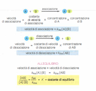 La costante di equilibrio \(K\) che descrive una reazione chimica si applica in modo del tutto analogo all’associazione non covalente A + B ⇌ AB. All’equilibrio, quando la velocità di associazione eguaglia la velocità di dissociazione, le concentrazioni \([A]\), \([B]\) e \([AB]\) consentono di calcolare \(K\) secondo: