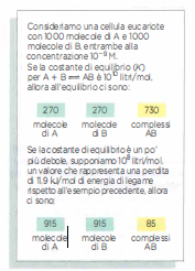e vale sempre \( \Delta G = \Delta G^\circ + RT\,\ln Q \) e, all’equilibrio, \( \Delta G^\circ = -RT\,\ln K \). Un esempio: per \( 2\text{A} + \text{B} \rightleftharpoons \text{A}_2\text{B} \) con \( K = 5{,}0 \times 10^2 \), a 37 °C si ottiene \( \Delta G^\circ \approx -15{,}3 \) kJ/mol; all’equilibrio, questo implica \( [\text{A}_2\text{B}] \approx 500\, [\text{A}]^2[\text{B}] \), quindi la reazione è fortemente spostata verso il complesso.