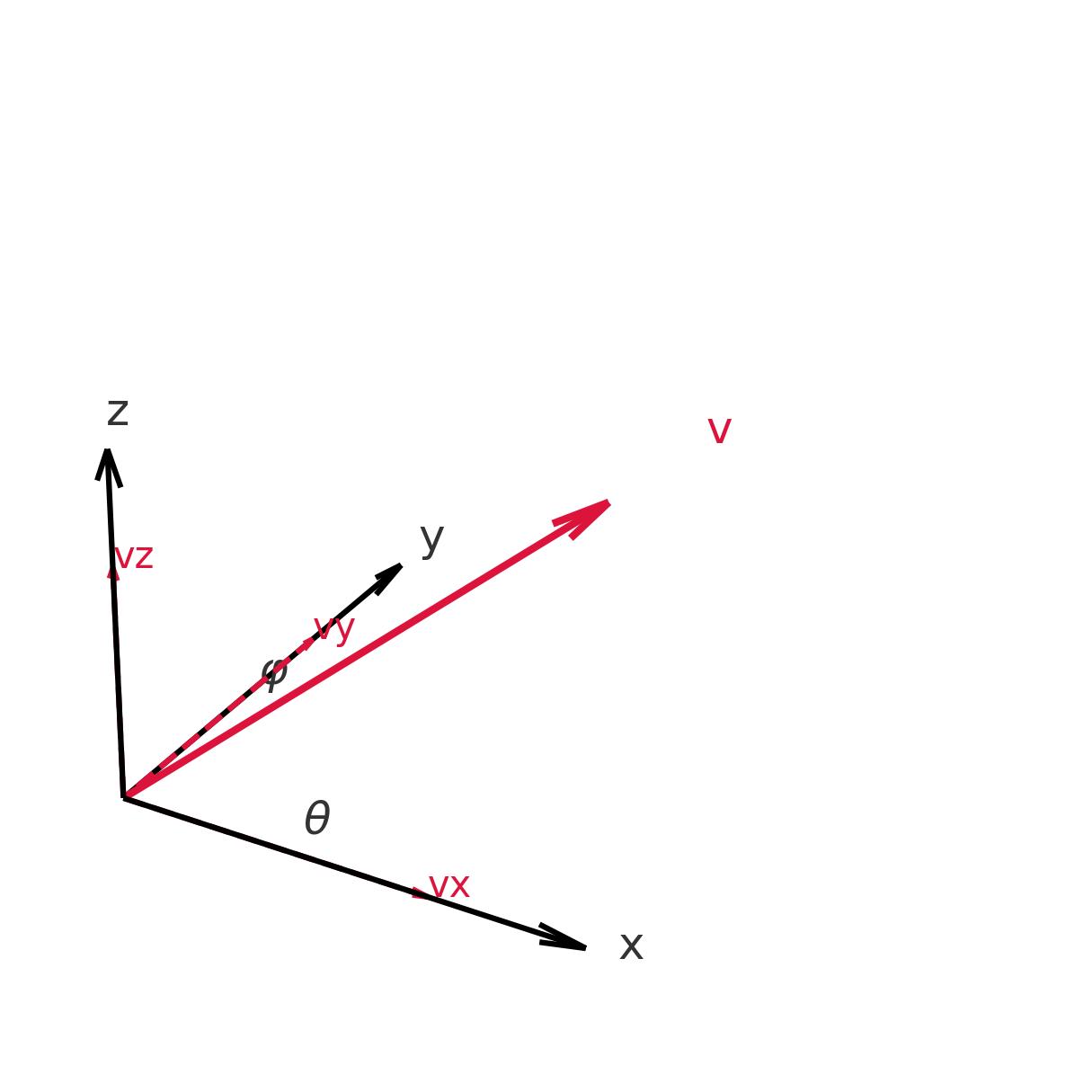 \[ \begin{aligned} v_{x} &= |\mathbf{v}| \cos \theta \sin \phi \\ v_{y} &= |\mathbf{v}| \sin \theta \sin \phi \\ v_{z} &= |\mathbf{v}| \cos \phi \end{aligned} \]