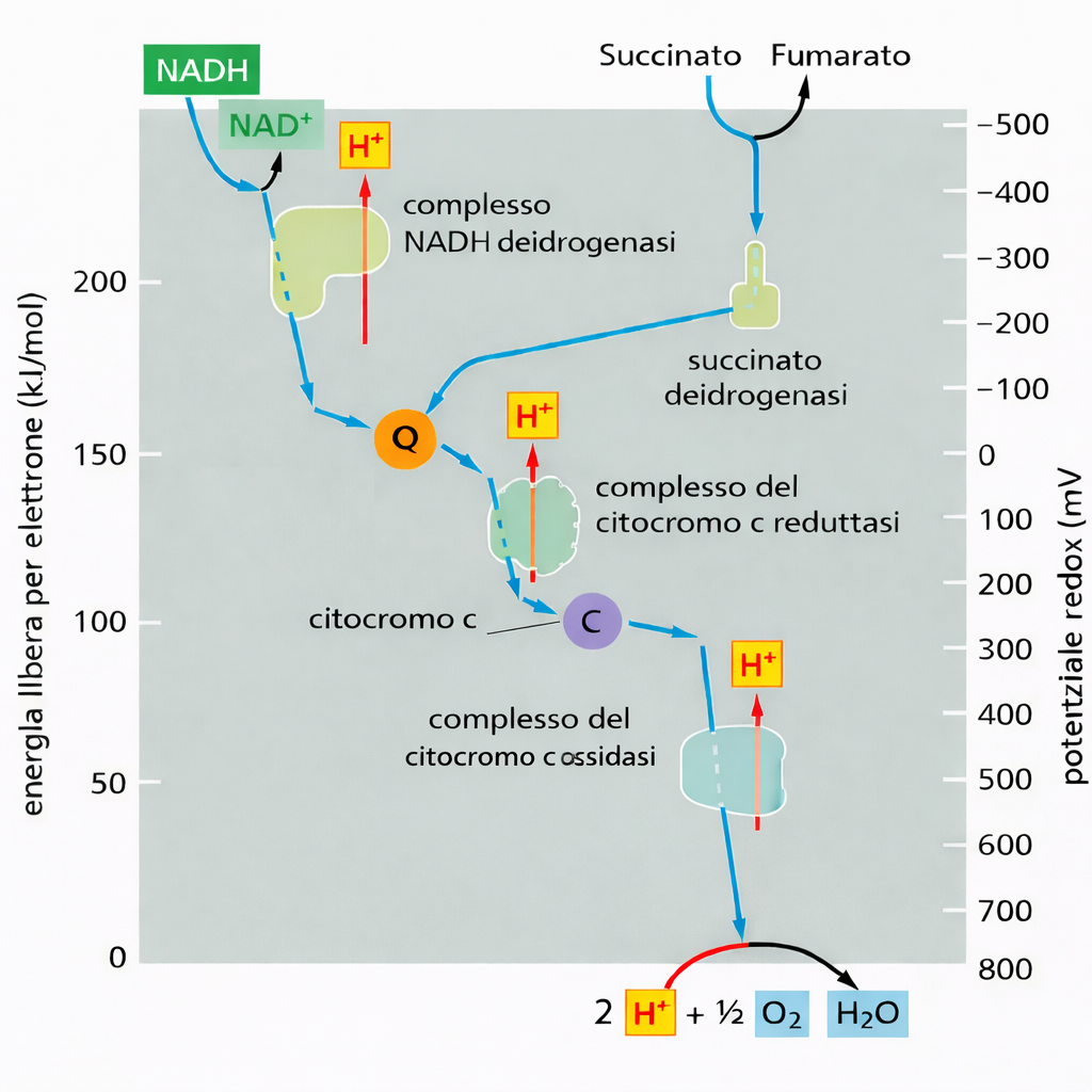 - coppie a potenziale più alto fungono da pozzi elettronici, come O₂/H₂O alla fine della catena;