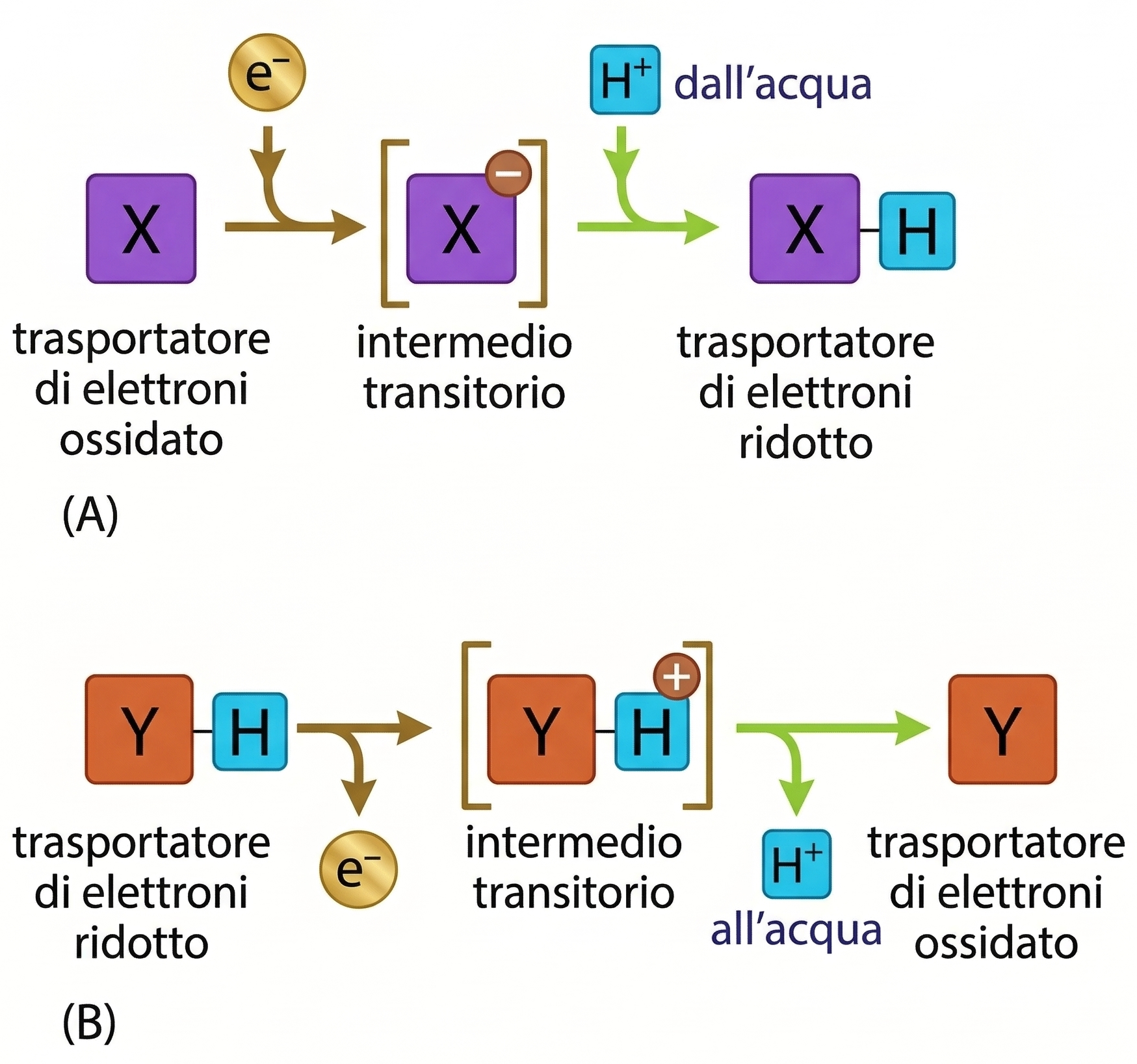 I protoni si comportano in modo peculiare rispetto ad altri cationi monovalenti quali Na⁺ e K⁺. L’idrogeno è l’elemento più abbondante nelle biomolecole e nell’acqua, e la rete di legami a idrogeno che interconnette le molecole d’acqua rende gli H⁺ straordinariamente mobili, grazie a meccanismi di “salto” protonico nella matrice acquosa. L’acqua intracellulare agisce quindi da esteso serbatoio in grado di donare o accettare protoni in tempi estremamente rapidi. Nei processi di ossidazione e riduzione, i trasferimenti di elettroni sono frequentemente accoppiati a movimenti di protoni. Quando una specie chimica si riduce acquisendo un elettrone (e⁻), la carica negativa in eccesso viene spesso bilanciata dall’associazione di un protone dall’acqua: l’effetto netto equivale al trasferimento di un atomo di idrogeno, H⁺ + e⁻ (Figura 05.13-01). Viceversa, durante l’ossidazione, un elettrone può essere rimosso da un atomo di idrogeno della molecola, con rilascio del protone nell’acqua circostante (Figura 05.13-01). In un contesto di membrana scarsamente permeabile agli ioni, l’organizzazione spaziale dei trasportatori elettronici consente di “separare” i percorsi degli elettroni da quelli dei protoni, trasformando il trasferimento redox in un pompaggio vettoriale di H⁺ da un lato all’altro della membrana. Dal punto di vista molecolare, i complessi di trasporto possono realizzare il pompaggio di protoni mediante due strategie non mutuamente esclusive: