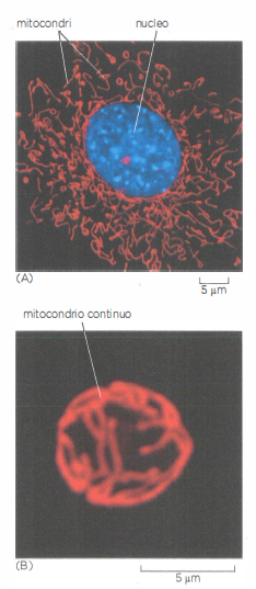 Pur derivando da antenati batterici, i mitocondri hanno acquisito una notevole adattabilità, riorganizzandosi in risposta allo stato metabolico cellulare. Possono muoversi lungo i microtubuli, ancorarsi dove il fabbisogno energetico è elevato e modulare il proprio numero tramite biogenesi e mitofagia. In cellule contrattile-intense, come i cardiomiociti, si dispongono in prossimità dell’apparato sarcomerico per fornire ATP a pochi nanometri dalla richiesta meccanica; negli spermatozoi circondano l’assonema del flagello per sostenere la motilità (Figura 05.12-01). In altri contesti, formano reti tubulari estese e altamente dinamiche che attraversano il citoplasma (Figura 05.12-02), sottoposte a continui eventi di scissione e fusione (Figura 05.12-15), processi mediati da GTPasi come DRP1 (fissione) e MFN1/2 e OPA1 (fusione).