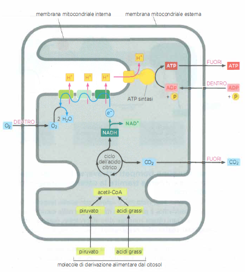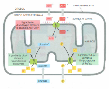 - Simtrasporto H⁺/piruvato e H⁺/fosfato inorganico (Pᵢ), che utilizza lo scorrimento favorevole dei protoni per importare nella matrice le molecole necessarie alla produzione di acetil-CoA e all’ossidazione fosforilativa;