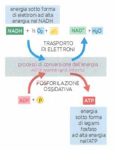 La membrana mitocondriale interna, pertanto, agisce da trasduttore: converte l’energia degli elettroni provenienti da NADH e FADH₂ nell’energia del legame fosfato dell’ATP (Figura 05.12-08). Questo processo, definito fosforilazione ossidativa, comprende simultaneamente l’utilizzo di O₂ e la fosforilazione dell’ADP a ATP. In molte cellule animali si ottengono in media circa 2,5 molecole di ATP per ogni NADH ossidato e circa 1,5 per ogni FADH₂, valori che possono variare in funzione delle condizioni fisiologiche e dell’assetto della catena respiratoria.