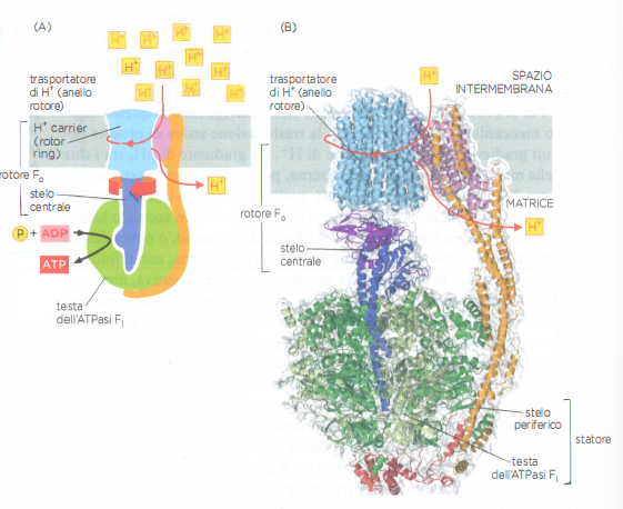 L’enzima responsabile, l’ATP sintasi, è un complesso multiproteico conservato lungo l’evoluzione e presente in mitocondri, cloroplasti e batteri. La porzione catalitica F1, simile a una “testa” che sporge nella matrice, è collegata tramite uno stelo centrale al motore di membrana Fo, un traslocatore di H⁺ che attraversa il doppio strato lipidico (Figura 05.12-11). Il passaggio dei protoni attraverso Fo induce la rotazione del suo anello c e dello stelo γ, i quali a loro volta determinano cambiamenti conformazionali ciclici nelle subunità β della testa F1. Secondo il meccanismo del “cambio conformazionale” proposto da P. Boyer, tali variazioni guidano in sequenza il legame dell’ADP e del Pᵢ, la sintesi dell’ATP e il rilascio del prodotto. In condizioni fisiologiche, la macchina catalitica compie cicli estremamente rapidi, con frequenze di turnover dell’ordine di decine–centinaia al secondo; una rotazione completa del rotore corrisponde tipicamente alla formazione di tre molecole di ATP.