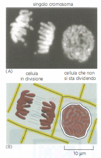 I cromosomi si rendono visibili quando la cellula eucariote si prepara a dividersi. (A) Due cellule vegetali adiacenti fotografate al microscopio ottico a fluorescenza. Il DNA è stato trattato con un colorante fluorescente (DAPI) che lo lega specificamente. Il DNA si trova nei cromosomi, che diventano visibili al microscopio ottico solo quando si addensano in preparazione alla divisione cellulare, come si vede a sinistra. Per chiarezza, un singolo cromosoma è stato ombreggiato (in marrone) nella cellula in divisione. La cellula a destra, che non si sta dividendo, contiene gli stessi cromosomi, che però non si possono identificare al microscopio ottico in questa fase del ciclo vitale perché il DNA ha una conformazione molto più distesa. (B) Profilo schematico delle due cellule e dei loro cromosomi.