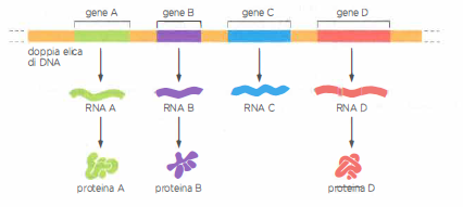 La maggior parte dei geni contiene informazioni per produrre le proteine. Come esposto, ogni gene che codifica proteine viene impiegato nella sintesi di molecole di RNA, che a loro volta pilotano la sintesi di molecole proteiche specifiche. Si noti che per una certa quantità di geni il prodotto finale è la stessa molecola di RNA, come mostrato qui per il gene C. In questi casi l’espressione genica è completa una volta che la sequenza nucleotidica del DNA è stata trascritta nella sequenza nucleotidica del suo RNA.