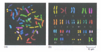 È possibile “colorare” ogni cromosoma umano di un colore diverso per riuscire a identificarlo al microscopio ottico senza ambiguità. Questi cromosomi sono stati isolati da una cellula con il nucleo in divisione (in mitosi) e quindi hanno una struttura estremamente compatta (condensata). I cromosomi multicolori si ottengono trattandoli con una serie di molecole di DNA umano marcate con una combinazione di coloranti fluorescenti. Per esempio, le molecole di DNA derivate dal cromosoma 1 si marcano con una certa combinazione di coloranti, le molecole di DNA derivate dal cromosoma 2 con un’altra e così via. Dato che il DNA marcato va a ibridarsi, cioè a formare accoppiamenti di basi, solo con il cromosoma di origine, ogni cromosoma si marca diversamente. In questi esperimenti i cromosomi subiscono trattamenti che, pur mantenendo la struttura relativamente intatta, separano il DNA a doppia elica nei due filamenti per far appaiare ciascuno di essi con il DNA marcato a singolo filamento. (A) Cromosomi visualizzati così come fuoriescono dalla cellula lisata.(B) Gli stessi cromosomi allineati artificialmente in ordine numerico. Questa disposizione della serie completa di cromosomi si chiama cariotipo.