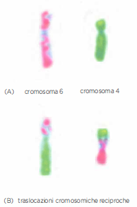 Cromosomi anomali sono associati ad alcuni difetti genetici ereditari. (A) Due cromosomi umani normali, il cromosoma 6 e il cromosoma 4, sono stati marcati come descritto nella Figura 02.03-01. (B) In un individuo con una traslocazione cromosomica reciproca, un segmento di un cromosoma è stato scambiato con un segmento di un altro. Tali traslocazioni cromosomiche sono un evento frequente nelle cellule tumorali.