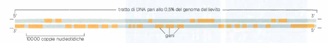 Nel lievito, i geni sono strettamente impacchettati lungo i cromosomi. Questa figura mostra una piccola regione della doppia elica del DNA in un cromosoma del lievito S. cerevisiae. Il genoma di S. cerevisiae contiene circa 12,5 milioni di coppie nucleotidiche e 6600 geni, distribuiti su 16 cromosomi. Si noti che, per ciascun gene, solo uno dei due filamenti di DNA codifica effettivamente le informazioni per produrre una molecola di RNA. Questa regione codificante può essere su entrambi i filamenti, come indicato dalle barre arancioni. Tuttavia, si ritiene che ogni “gene” includa sia il “filamento codificante” sia il suo complementare. L’alta densità dei geni è caratteristica di S. cerevisiae.