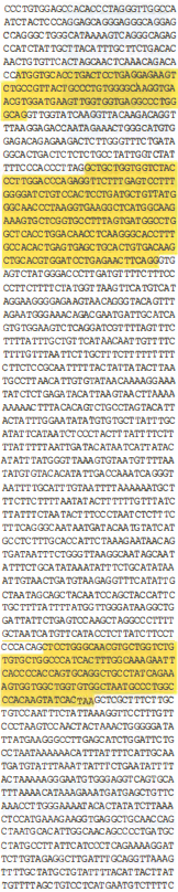 In molti eucarioti, i geni includono un eccesso di DNA inframezzato, non codificante. Qui è rappresentata la sequenza nucleotidica del gene della β-globina umana. Questo gene trasporta l’informazione che specifica la sequenza amminoacidica di uno dei due tipi di subunità presenti nell’emoglobina, una proteina che trasporta l’ossigeno nel sangue. È mostrata solo la sequenza del filamento codificante: il filamento non codificante ospita la sequenza complementare. A partire dall’estremità 5′, tale sequenza viene letta da sinistra a destra, come qualsiasi libro di testo. I segmenti della sequenza del DNA che codificano la sequenza amminoacidica della β-globina sono evidenziati in giallo. Vedremo successivamente come queste informazioni vengano trascritte e tradotte per produrre una proteina β-globina completa.
