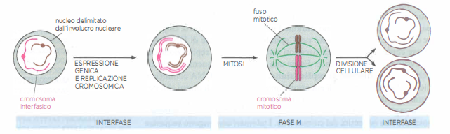 Nelle cellule che proliferano la replicazione e la divisione dei cromosomi avvengono secondo una serie di stadi prevedibili, detti nell’insieme ciclo cellulare. Durante l’interfase, la cellula esprime molti dei suoi geni e, durante parte di questa fase, duplica i cromosomi. Una volta che il DNA ha finito di replicarsi, la cellula può entrare nella fase M, in cui avviene la divisione cellulare o mitosi. In questo stadio i cromosomi si condensano, l’espressione genica è in gran parte sospesa, l’involucro nucleare si frammenta e si forma il fuso mitotico, composto da microtubuli e altre proteine. Il fuso mitotico cattura i cromosomi condensati e ne trascina una serie completa a ciascun polo della cellula; intorno a ogni corredo cromosomico si riforma la membrana nucleare e, nell’ultima tappa della fase M, la cellula si divide in due cellule figlie. Per semplicità nello schema sono indicati solo due cromosomi diversi.