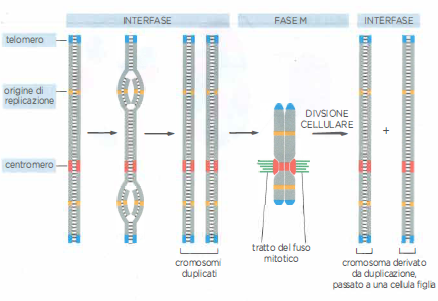 Tre sono gli elementi che devono essere presenti nella sequenza del DNA perché il cromosoma eucariote possa replicarsi e poi segregare al momento della mitosi. Ogni cromosoma ha origini di replicazione multiple, un centromero e due telomeri. Nella figura è schematizzata la serie di eventi che interessano un cromosoma tipico durante il ciclo cellulare. Durante l’interfase il DNA si replica a partire dalle origini di replicazione in entrambe le direzioni e per tutta la sua lunghezza. Nella fase M il centromero attacca ognuno dei cromosomi duplicati al fuso mitotico, in modo che, quando la cellula si divide, una copia venga distribuita a ognuna delle cellule figlie. Prima della divisione cellulare, il centromero serve anche a mantenere insieme i cromosomi duplicati finché non sono pronti a separarsi. I telomeri contengono sequenze di DNA che consentono la duplicazione completa delle estremità cromosomiche.