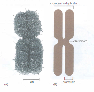 Un tipico cromosoma mitotico duplicato è ipercompatto. Poiché il DNA viene replicato durante l’interfase, ogni cromosoma mitotico duplicato contiene due molecole di DNA figlie identiche (Figura 02.03-07). Ciascuna di queste molecole lunghissime di DNA, insieme alle proteine associate, si chiama cromatide. Una volta separati, i due cromatidi fratelli vengono considerati cromosomi singoli. (A) Un cromosoma mitotico fotografato al microscopio elettronico a scansione. I due cromatidi sono accorpati: la zona di strozzatura indica la posizione del centromero. (B) Rappresentazione schematica di un cromosoma mitotico.