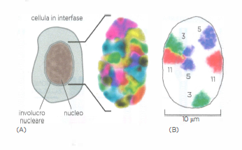 Nel nucleo i cromosomi interfasici occupano specifiche regioni diverse. Per distinguere tramite colorazione specifica i singoli cromosomi interfasici nella cellula umana, si impiegano sonde (probes) a DNA accoppiate a coloranti fluorescenti diversi. (A) Con il microscopio a fluorescenza si vede che il nucleo è riempito con un mosaico di colori distinti. (B) Per evidenziare le loro posizioni, vengono individuate tre serie di cromosomi: cromosoma 3, 5 e 11. Si noti che le coppie di cromosomi omologhi, come le due copie del cromosoma 3, non si trovano generalmente nella stessa posizione.