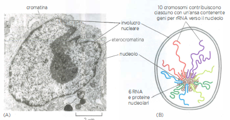 Il nucleolo è la struttura più cospicua del nucleo interfascico. (A) Sezione ultrasottile di un nucleo di fibroblasto umano al microscopio elettronico. Il nucleo è circondato dall’involucro nucleare. Al suo interno, la cromatina si presenta come una massa diffusa e marmorizzata, con regioni più dense, dette eterocromatina (di colorazione scura). L’eterocromatina è povera di geni e si dispone principalmente alla periferia del nucleo, subito sotto l’involucro nucleare. L’ampia regione scura centrale è il nucleolo, che contiene i geni per l’RNA ribosomiale. (B) Illustrazione schematica che mostra come i geni per l’RNA ribosomiale, raggruppati vicino alle estremità di cinque diversi cromosomi umani (13, 14, 15, 21 e 22), si uniscono per formare il nucleolo, un sottocompartimento biochimico prodotto dall’aggregazione di una serie di macromolecole: DNA, RNA e proteine.
