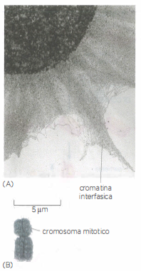Nel cromosoma interfascico il DNA è meno compatto che nel cromosoma mitotico. (A) Immagine al microscopio elettronico che mostra un enorme groviglio di cromatina (DNA e proteine associate) mentre sta uscendo da un nucleo interfascico lisato. (B) Rappresentazione schematica di un cromosoma mitotico umano della stessa scala.