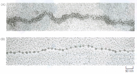 I nucleosomi sono visibili al microscopio elettronico. (A) Cromatina isolata direttamente da un nucleo interfascico, che si presenta al microscopio elettronico come una fibra cromatinica composta da nucleosomi impacchettati. (B) Un’altra microfotografia elettronica mostra un tratto di cromatina distesa, decondensata artificialmente e isolata per mettere in evidenza l’aspetto a “collana di perle” dei nucleosomi.