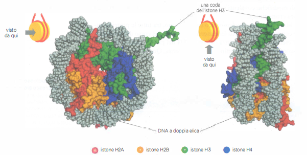 La struttura della particella nucleosomica centrale, determinata con l’analisi di diffrazione ai raggi X, mostra come il DNA si avvolga intorno al corpo istonico discoidale. La struttura del nucleosoma è mostrata da due angolazioni diverse. I due filamenti della doppia elica di DNA sono in grigio. Si vede sporgere dal nucleosoma un tratto di coda dell’istone H3 (in verde), mentre le code delle altre proteine istoniche sono state troncate.