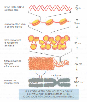 Nei cromosomi il DNA si organizza a parecchi livelli. Lo schema illustra come livelli crescenti di organizzazione del DNA possano dare origine a un cromosoma mitotico altamente condensato. Queste condensazioni sono guidate sia dall’istone H1 sia da un insieme di proteine cromosomiche non istoniche specializzate, tra cui le proteine di bloccaggio dei cromosomi, che formano un’ansa, e la condensina, un’abbondante proteina non istonica. Tuttavia, le strutture reali sono ancora incerte.