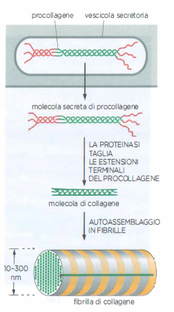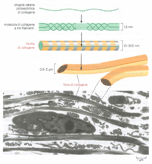 La singola molecola di collagene (tropocollagene) è formata da tre catene polipeptidiche che si avvolgono in una tripla elica, stabilizzata dalla presenza ripetuta del motivo Gly–X–Y, in cui X e Y sono spesso prolina e idrossiprolina. La idrossilazione di prolina e lisina, dipendente da vitamina C, rigidifica la tripla elica; deficit di questa modificazione riducono la stabilità del collagene. Le molecole, una volta secrete, si dispongono in modo ordinato formando fibrille di collagene, filamenti di diametro compreso tra 10–300 nm e lunghi più micrometri, che possono ulteriormente aggregarsi in fibre più spesse (Figura 06.02-07). I legami crociati covalenti, catalizzati da lisil ossidasi, incrementano la resistenza alla trazione. Altri collageni non fibrillari (ad esempio i tipi di rete) si localizzano alla superficie delle fibrille o nelle lamine basali, collegandole tra loro e con ulteriori componenti della matrice (Figura 06.02-05).