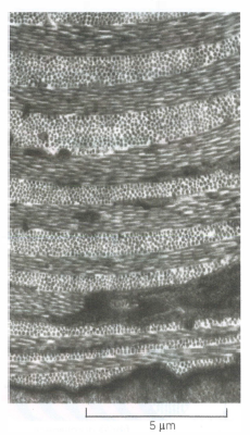 Perché le fibrille di collagene svolgano correttamente la loro funzione meccanica, la loro architettura deve essere ordinata e coerente con i carichi applicati. Nella cute, le fibrille si intrecciano con una disposizione simile a un tessuto intrecciato o si organizzano in lamelle sovrapposte con orientamento alternato, così da opporre resistenza alla trazione lungo più assi (Figura 06.02-10). Nei tendini, che trasmettono la forza dal muscolo all’osso, prevalgono fasci di fibrille allineati pressoché parallelamente alla direzione di trazione principale.