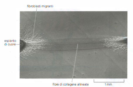 Le cellule del tessuto connettivo, in primis i fibroblasti, dirigono tale ordine depositando collagene con un orientamento preferenziale e rimodellandolo in seguito. Durante l’istogenesi, i fibroblasti migrano sulla matrice di collagene di nuova sintesi e applicano forze di trazione che ne determinano compattazione e allineamento, favorendo la formazione di lamine compatte e di cordoni fibrosi. Queste dinamiche sono state dimostrate in coltura: se si incorpora un numero controllato di fibroblasti in un gel di collagene con fibrille distribuite casualmente, le cellule generano trazione e “tirano” il collagene dal circostante, producendo fasci densi e orientati. Analogamente, collocando due piccoli espianti di tessuto embrionale ricchi di fibroblasti a distanza definita all’interno di un gel di collagene, il collagene interposto si riorganizza in una banda compatta di fibre allineate che collega i due espianti, fungendo da “ponte” (Figura 06.02-11). I fibroblasti migrano quindi lungo questa banda, seguendo le fibre allineate, creando un circuito di reciproca dipendenza: le cellule orientano le fibrille, e le fibrille guidano a loro volta la traiettoria delle cellule.