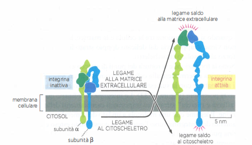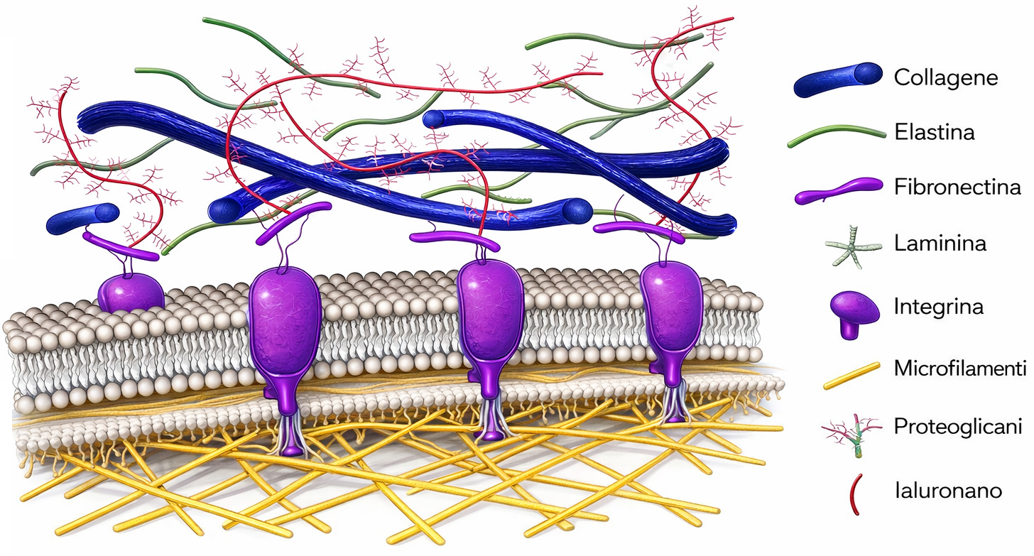 Le cellule ancorano e “sentono” la matrice extracellulare (ECM) grazie a recettori transmembrana della famiglia delle integrine. Il dominio extracellulare delle integrine riconosce specifici ligandi della ECM, mentre le code citoplasmatiche si connettono al citoscheletro, in particolare ai filamenti di actina, tramite proteine adattatrici come talina, kindlina, vinculina e paxillina. Questo accoppiamento meccanico conferisce punti di attacco robusti: senza tale collegamento, la forza esercitata verrebbe scaricata sul solo doppio strato lipidico, con rischio di estrazione del recettore dalla membrana.