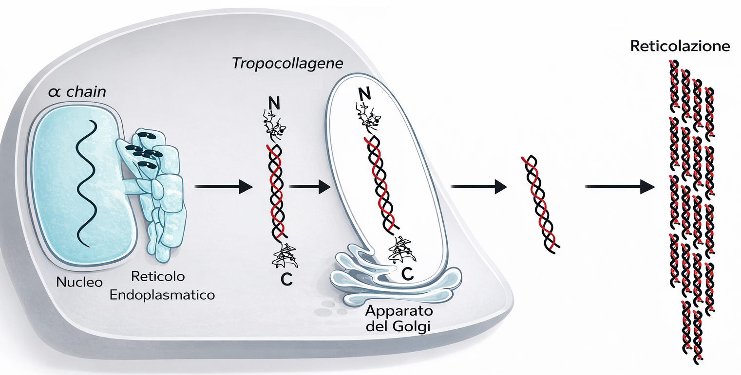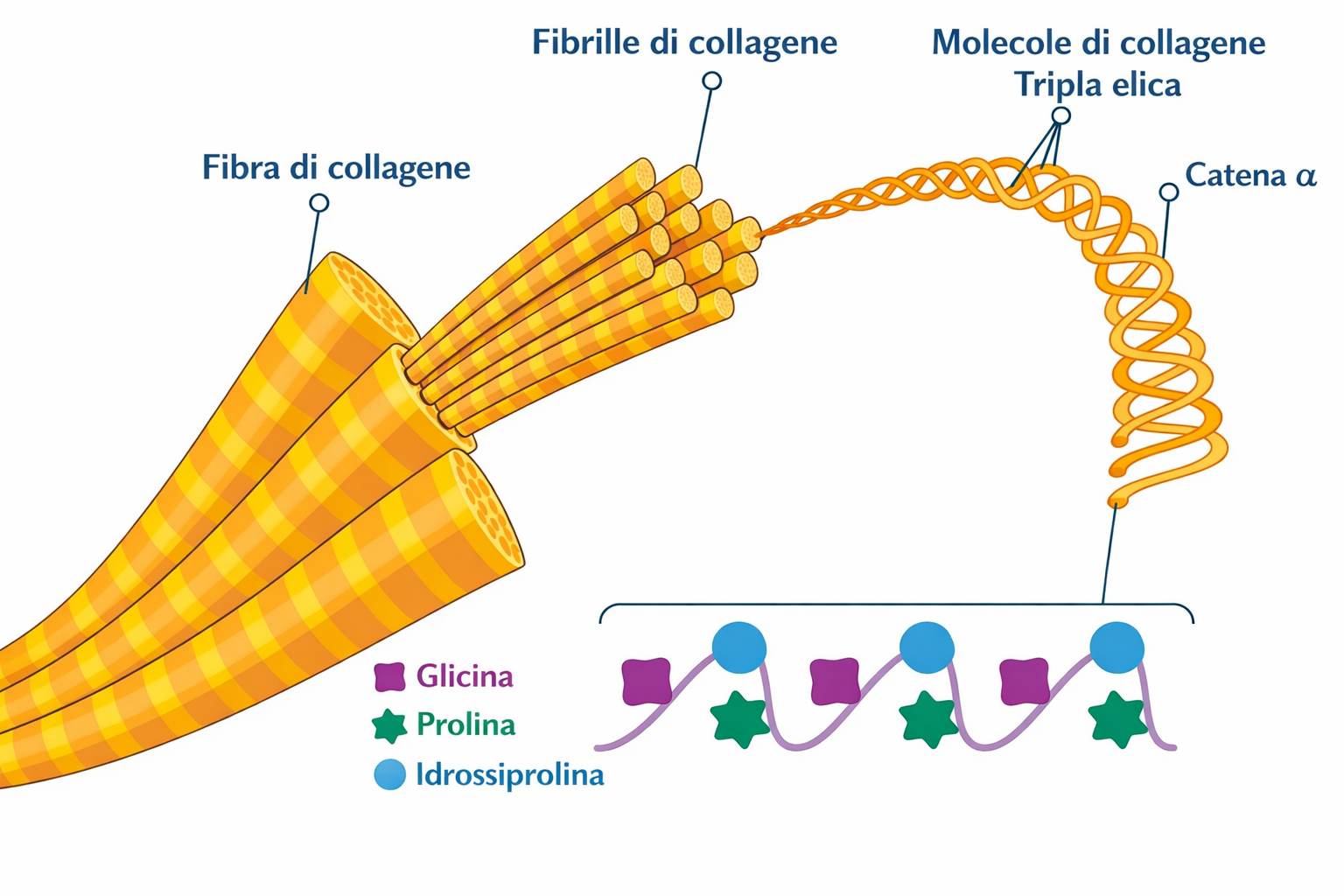 Il collagene è ubiquitario nel regno animale e comprende una famiglia numerosa di varianti. Nei mammiferi sono presenti decine di geni COL; nell’uomo si riconoscono 28 tipi di collagene distinti codificati da circa 45 geni. I collageni rappresentano le proteine strutturali dominanti in tendini, osso e cute (il cuoio è collagene trattato mediante concia) e costituiscono fino al 25% della massa proteica totale dell’adulto. Il collagene di tipo I è il più abbondante, arrivando a coprire circa il 90% del collagene corporeo (Figura 06.02-03).