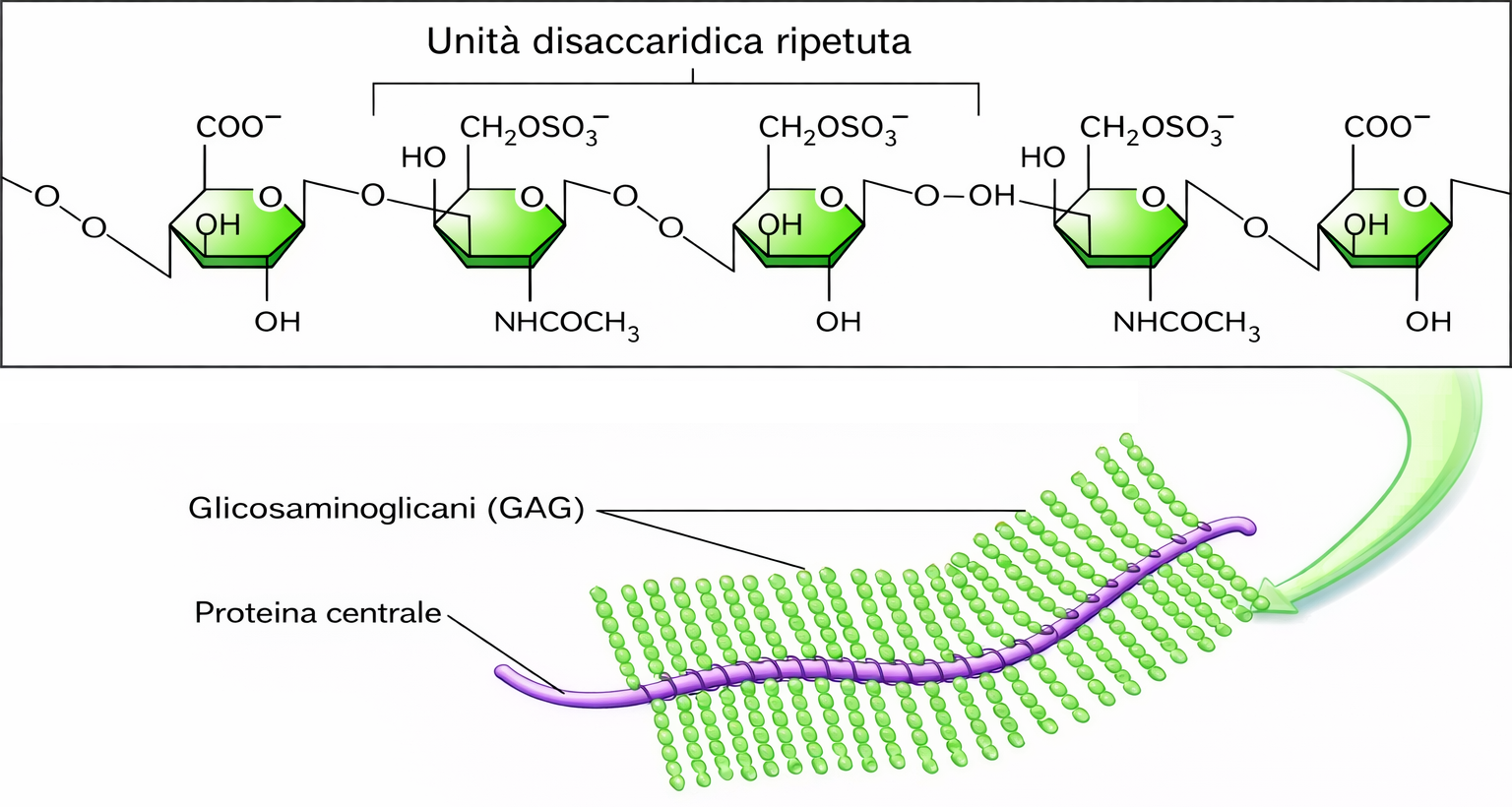 Se le fibrille di collagene conferiscono resistenza alla trazione, un insieme distinto di macromolecole della ECM fornisce il complemento meccanico: la resistenza alla compressione. Si tratta dei glicosamminoglicani (GAG), lunghe catene polisaccaridiche fortemente anioniche costituite da unità disaccaridiche ripetute (Figura 06.02-12). Nella matrice, i GAG sono per lo più legati covalentemente a proteine centrali formando proteoglicani, un gruppo estremamente eterogeneo per dimensioni, forma e proprietà chimiche. Tipicamente, molte catene GAG si inseriscono su una singola proteina core, che a sua volta può associare con il GAG libero ialuronano, generando complessi macromolecolari dalla struttura “a scovolino”. Nella cartilagine, l’aggrecano è particolarmente abbondante: oltre 100 catene GAG possono innestarsi su una proteina centrale, e molte di queste unità si associano allo ialuronano, attraverso proteine di collegamento, formando aggregati di massa molecolare di diversi milioni di dalton (Figura 06.02-13).
