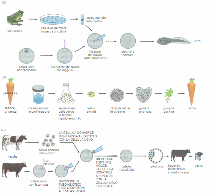 La differenziazione cellulare non implica una riscrittura irreversibile della sequenza del DNA nucleare. Ciò è stato dimostrato da esperimenti di trapianto nucleare: il nucleo di una cellula somatica differenziata, trasferito in un ovocita enucleato, può sostenere lo sviluppo completo di un organismo. Ad esempio, il nucleo di una cellula epidermica di rana, iniettato in una cellula uovo priva di nucleo, è in grado in alcuni casi di sostenere lo sviluppo fino al girino (Figura 03.09-01), indicando che non sono state perse informazioni genetiche essenziali. Approcci analoghi sono stati applicati ai mammiferi, portando alla generazione di organismi a partire da cellule differenziate di pecora, bovino, maiale, capra e topo. Nelle piante, la totipotenza è particolarmente evidente: cellule isolate di carota, ad esempio, possono rigenerare un intero individuo adulto.