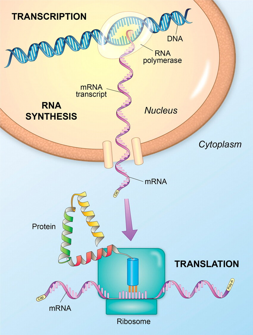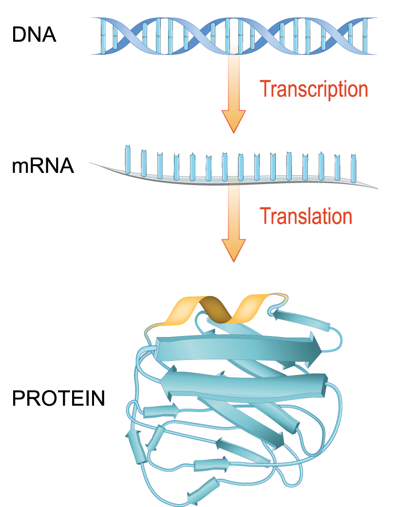 Le sequenze di DNA guidano la produzione di molecole di RNA, chimicamente affini ma funzionalmente diversificate: alcune svolgono ruoli regolatori, strutturali o catalitici, mentre la frazione più cospicua funge da matrice per la sintesi proteica. Il flusso informativo, riassumibile come \( \text{DNA} \rightarrow \text{RNA} \rightarrow \text{Proteina} \), costituisce il cosiddetto dogma centrale della biologia molecolare (Figura 01.02-02).