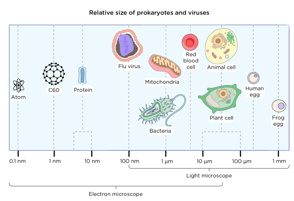 Un criterio immediato di confronto tra cellule è la dimensione. Una cellula batterica tipica, come un Lactobacillus presente in un formaggio stagionato, misura pochi micrometri (µm) in lunghezza, ossia all’incirca un venticinquesimo dello spessore medio di un capello umano. All’estremo opposto, l’uovo di rana, pur essendo una singola cellula, raggiunge circa 1 millimetro (mm) di diametro. Se un Lactobacillus venisse ingrandito fino all’altezza di una persona, l’uovo di rana, nella stessa scala, assumerebbe dimensioni paragonabili a una struttura sferica larga quasi un chilometro.