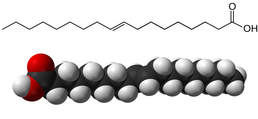 è il principale componente dell’olio d’oliva. Il nome IUPAC, acido cis-9-ottadecenoico, indica che il doppio legame in posizione 9 presenta configurazione cis: