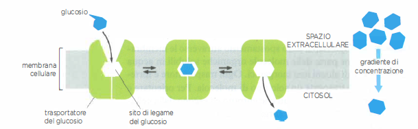 In condizioni di abbondanza di glucosio extracellulare, ad esempio dopo l’assorbimento intestinale post-prandiale, il legame del glucosio al sito esposto verso l’esterno favorisce la transizione conformazionale che ne consente il rilascio nel citosol, dove la concentrazione è inferiore (Figura 05.05-02). In molte cellule, l’immediata fosforilazione a glucosio-6-fosfato riduce ulteriormente la concentrazione di glucosio libero intracellulare, mantenendo favorevole l’ingresso. In senso opposto, durante il digiuno l’azione del glucagone sugli epatociti stimola la mobilizzazione del glicogeno e la gluconeogenesi; la concentrazione citosolica di glucosio può allora superare quella esterna e il trasportatore, esponendo il sito verso il citosol, facilita l’uscita del monosaccaride, che diventa disponibile per altri distretti.