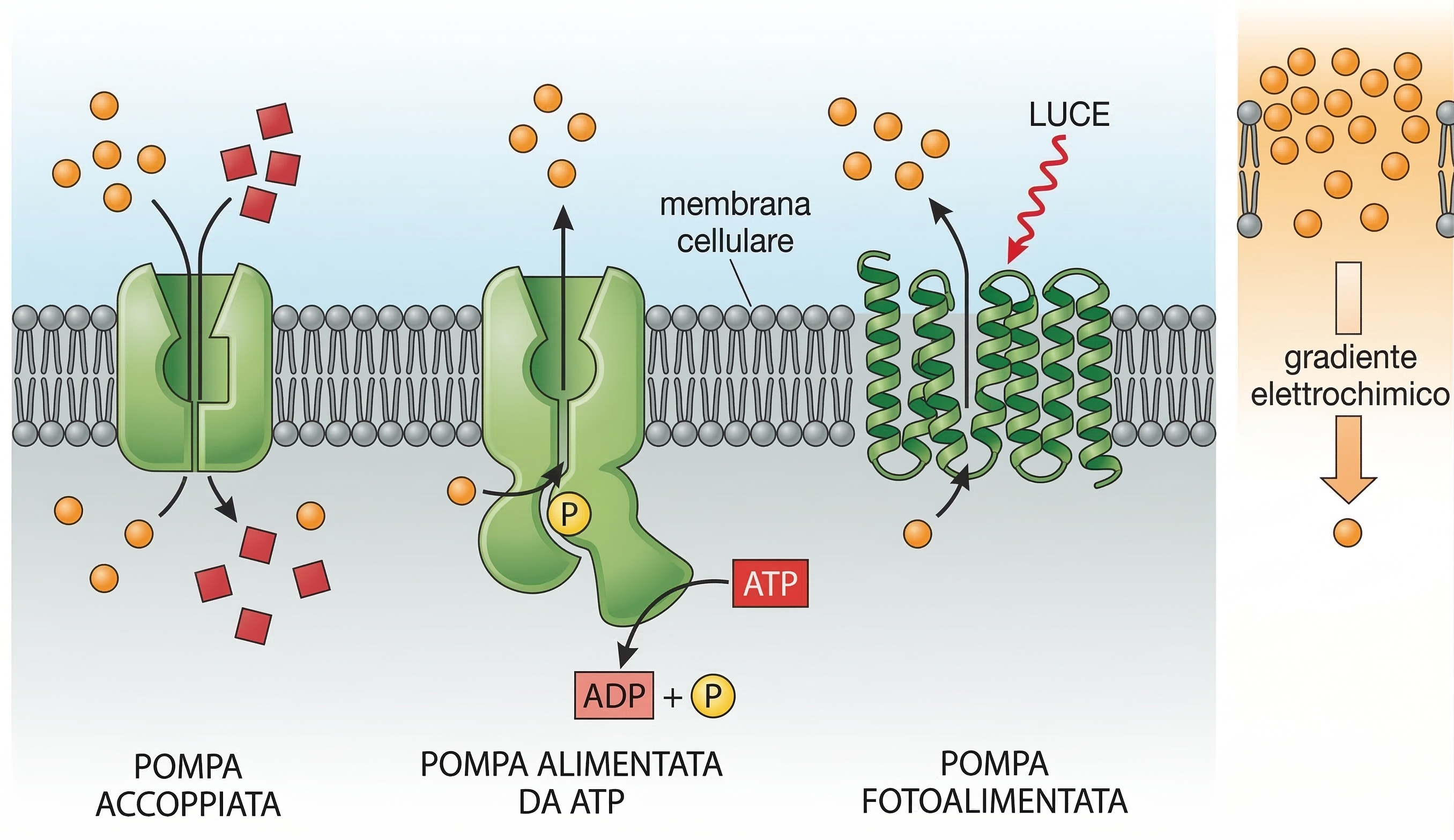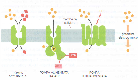 - pompe fotoattivate, tipiche soprattutto di procarioti, che utilizzano l’energia luminosa per generare gradienti ionici, come accade con la batteriorodopsina.