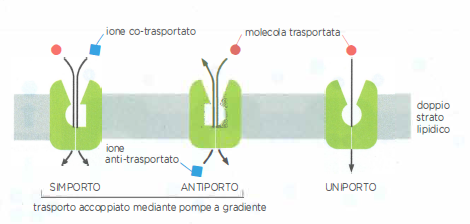 - trasportatori accoppiati, che collegano il movimento “a valle” di un soluto all’ingresso o all’uscita “in salita” di un altro soluto, realizzando simporto o antiporto;