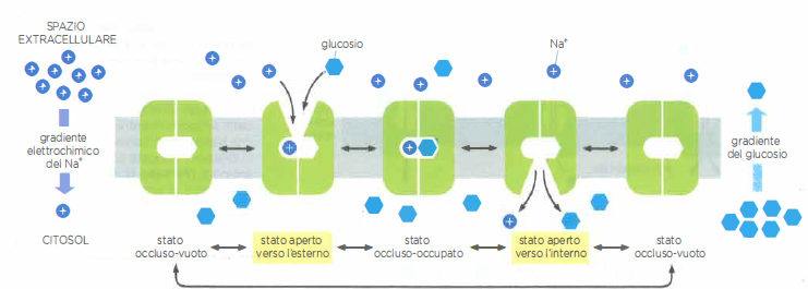 Nelle cellule animali, i simporti guidati dall’ingresso di Na⁺ sono ampiamente impiegati per l’assorbimento di nutrienti e ioni. Le cellule epiteliali dell’intestino tenue ne forniscono un esempio paradigmatico: la membrana apicale, rivolta verso il lume, esprime simporti Na⁺/glucosio che utilizzano l’energia del gradiente elettrochimico del sodio per introdurre glucosio anche quando la sua concentrazione citosolica è superiore a quella luminale. Il legame di Na⁺ e glucosio al trasportatore è cooperativo, per cui l’affinità per uno dei due aumenta quando l’altro è già legato; in assenza di uno dei due ligandi, il ciclo di trasporto non procede (Figura 05.05-09).