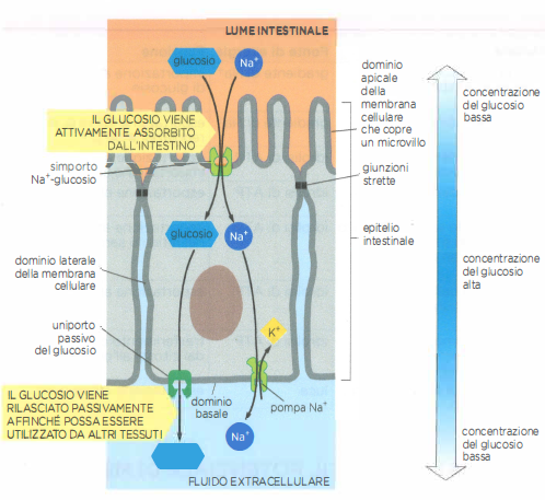 Per realizzare il trasferimento vettoriale del glucosio dall’intestino al sangue, gli enterociti organizzano i trasportatori in domini di membrana distinti: i simporti Na⁺/glucosio sono confinati al polo apicale, mentre nella membrana baso-laterale sono presenti uniporti del glucosio che consentono il rilascio passivo verso l’interstizio e quindi nel circolo ematico (Figura 05.05-10). Le giunzioni strette, situate in prossimità dell’orlo apicale, costituiscono una barriera alla diffusione laterale delle proteine di membrana, preservando la polarità funzionale dell’epitelio.