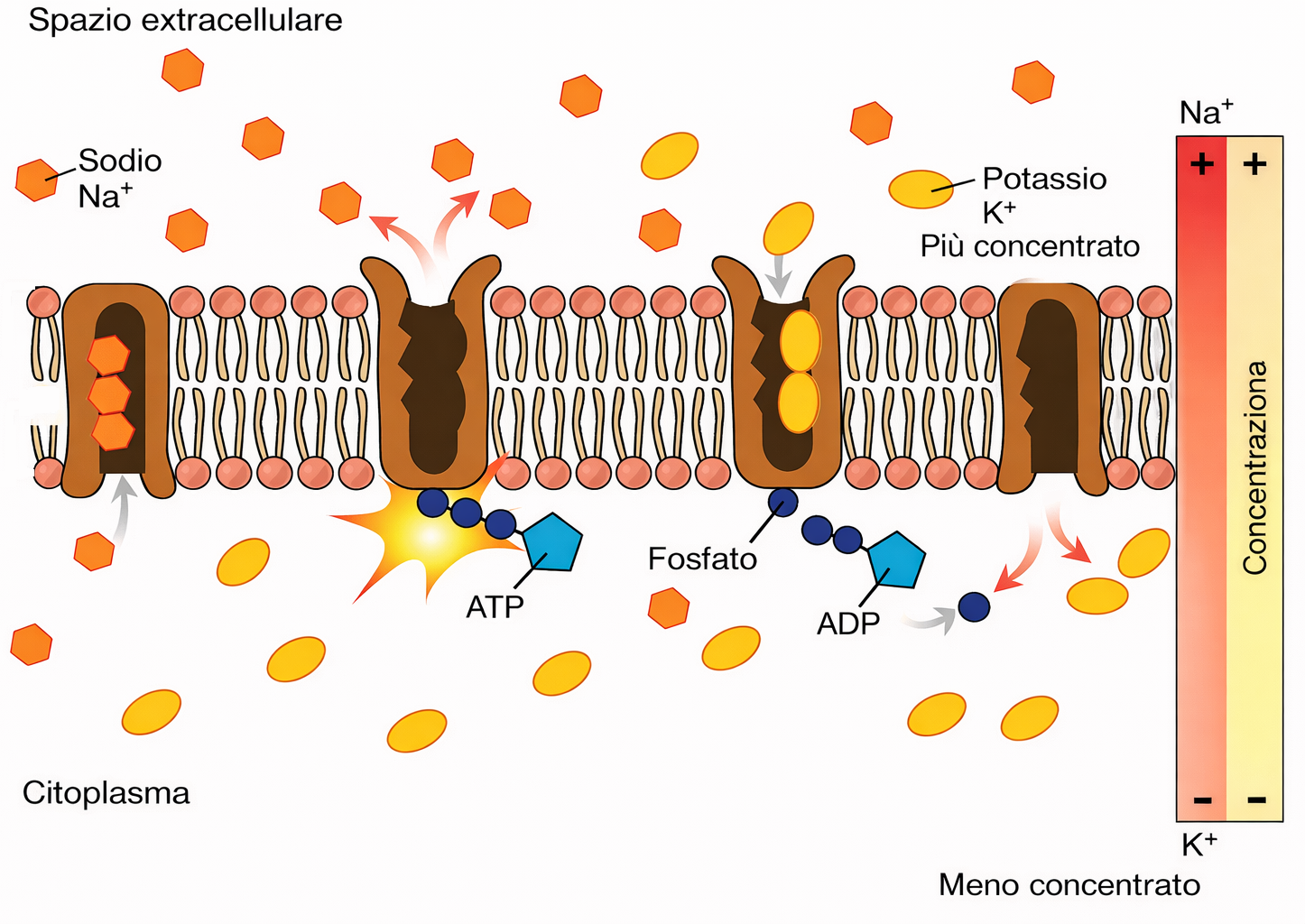 | Pompa Na⁺-K⁺ (ATPasi) | Membrana della maggior parte delle cellule animali | Idrolisi di ATP | Espulsione di Na⁺ e ingresso di K⁺ |