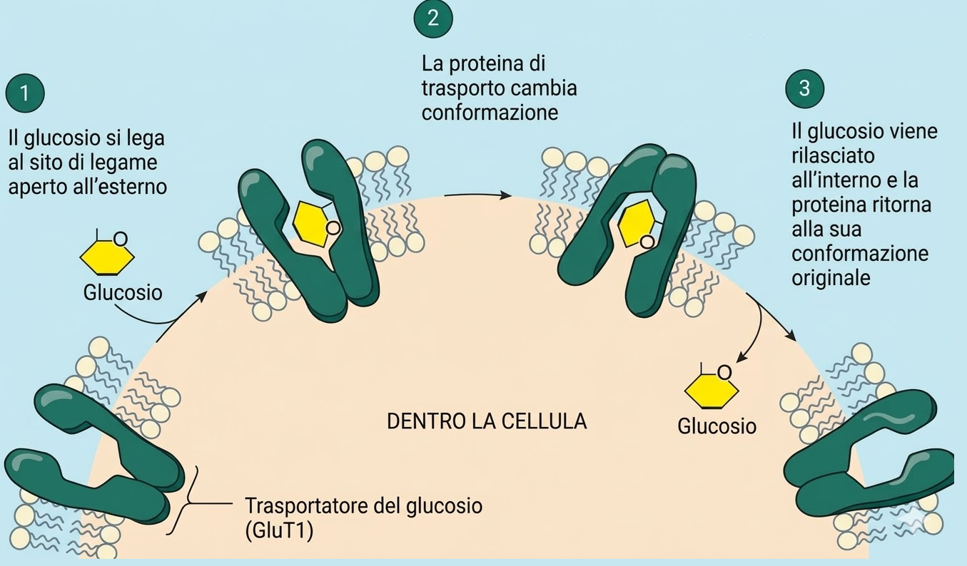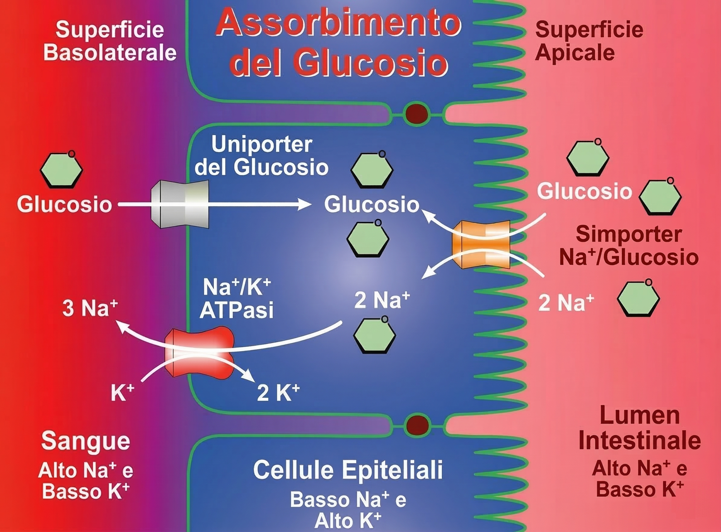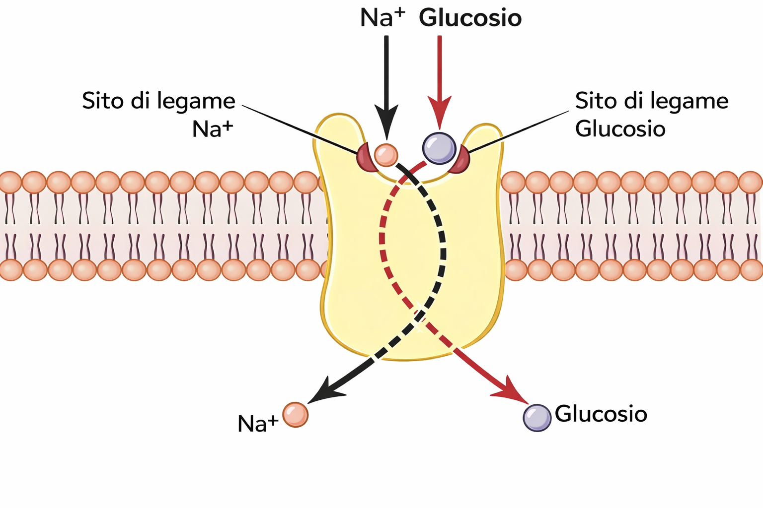 | Pompa Na⁺/glucosio (simporto) | Membrana apicale delle cellule intestinali e renali | Gradiente di Na⁺ | Importazione attiva di glucosio |