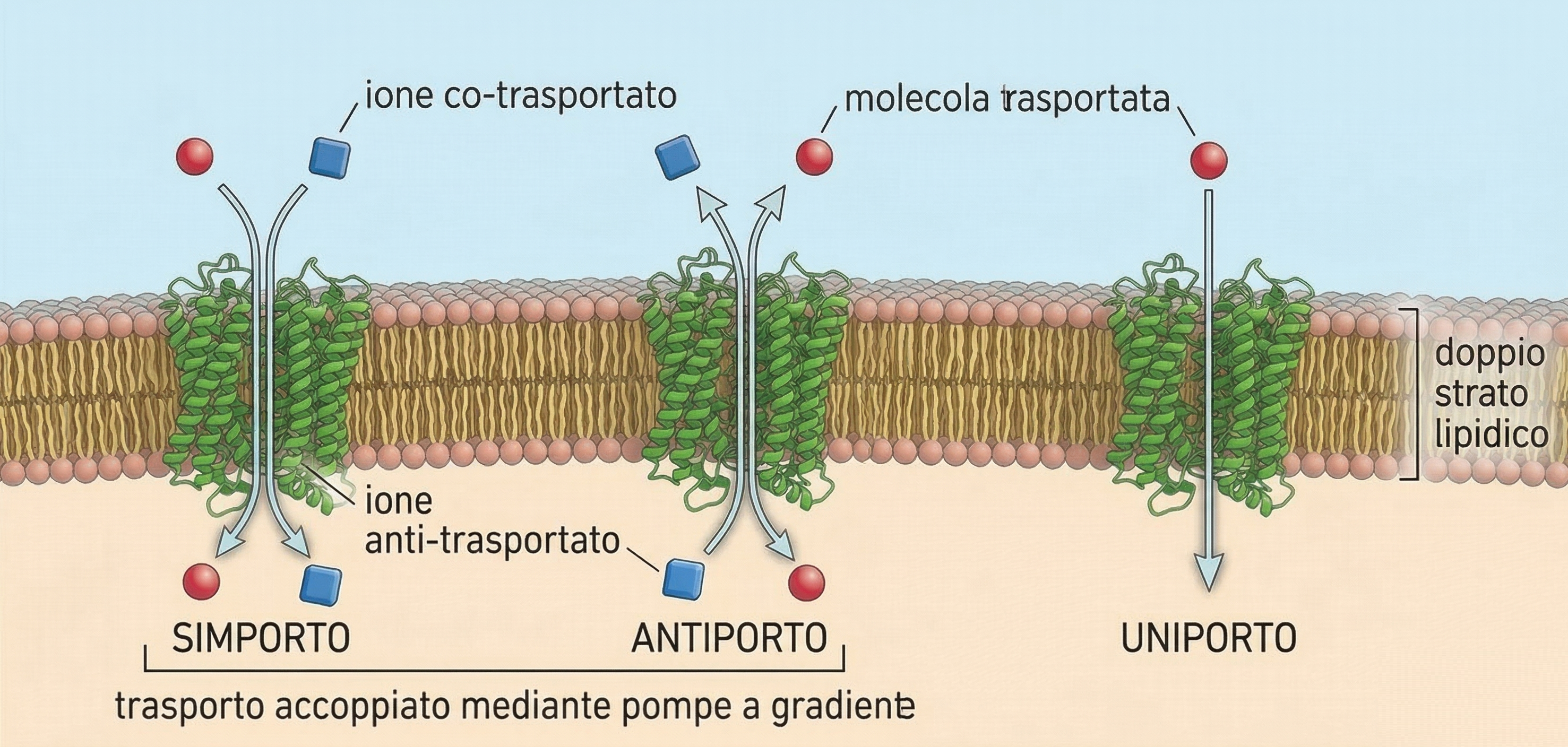I trasportatori di membrana sono proteine integrali specializzate nel trasferimento attraverso i doppî strati lipidici della gran parte delle piccole molecole idrosolubili e di specifici ioni inorganici. La loro attività è altamente selettiva: ciascun trasportatore riconosce con elevata specificità una o poche specie molecolari. Per assicurare un flusso ordinato di soluti tra citosol e organuli, ogni membrana biologica ospita un corredo distinto di trasportatori coerente con la funzione del compartimento. La membrana plasmatica, ad esempio, esprime trasportatori per l’ingresso di nutrienti quali zuccheri, amminoacidi e nucleotidi; la membrana lisosomiale contiene una pompa per H⁺ che acidifica il lume lisosomiale, oltre a trasportatori deputati a riversare nel citosol i prodotti della digestione; la membrana interna mitocondriale possiede carrier che importano piruvato, combustibile per la sintesi di ATP, e sistemi che scambiano nucleotidi, consentendo l’uscita dell’ATP neoformato. Seguono i principi generali di funzionamento dei trasportatori e i meccanismi molecolari che governano il movimento di soluti di rilevanza fisiologica.