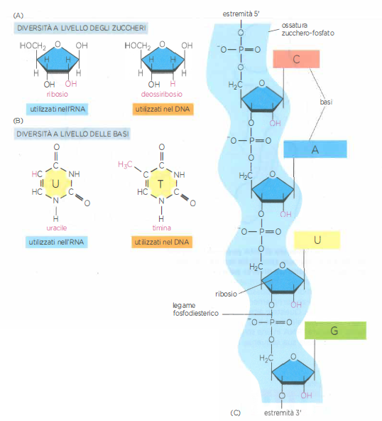 i nucleotidi dell’RNA sono ribonucleotidi e contengono ribosio, mentre quelli del DNA contengono desossiribosio;