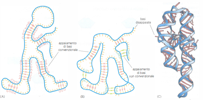 Le molecole di RNA possono ripiegarsi per formare strutture specifiche tenute insieme da legami idrogeno tra diverse paia di basi. L’RNA è a filamento singolo, ma contiene spesso brevi tratti di nucleotidi che si possono appaiare perché trovano sequenze complementari in altre zone della stessa molecola. Queste e altre interazioni di tipo “non convenzionale” tra le basi, per esempio A–G, fanno ripiegare l’RNA in una struttura tridimensionale determinata dalla sua sequenza nucleotidica. (A) Schema di una struttura ipotetica di RNA ripiegata, dove sono indicati soltanto gli appaiamenti tra basi di tipo convenzionale (G–C e A–U) (in rosso). (B) L’inserimento delle interazioni non convenzionali (in verde) modifica la struttura dell’RNA ipotetico mostrato in (A). (C) Modello di una molecola vera di RNA coinvolta nello splicing dell’RNA. Il numero considerevole di strutture a doppia elica presente su questo RNA è prodotto dall’appaiamento di basi convenzionale.