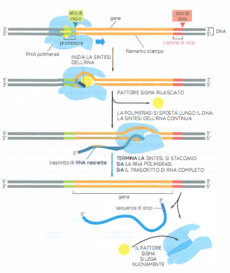 Appositi segnali della sequenza nucleotidica di un gene indicano all’RNA polimerasi batterica dove cominciare e terminare la trascrizione. L’RNA polimerasi batterica (in celeste) contiene una subunità chiamata fattore sigma (in giallo) che riconosce il promotore di un gene (in verde). Una volta che la trascrizione è iniziata, il fattore sigma si stacca e la polimerasi si sposta in avanti continuando la sintesi dell’RNA. L’allungamento della catena prosegue finché la polimerasi non incontra una sequenza nel gene detta codone di stop (in rosso). In quel punto l’enzima si arresta, sganciando sia lo stampo di DNA sia il nuovo trascritto di RNA. Poi la polimerasi si riassocia con un fattore sigma libero e, quando incontra un nuovo promotore, può dare nuovamente inizio alla stessa procedura.